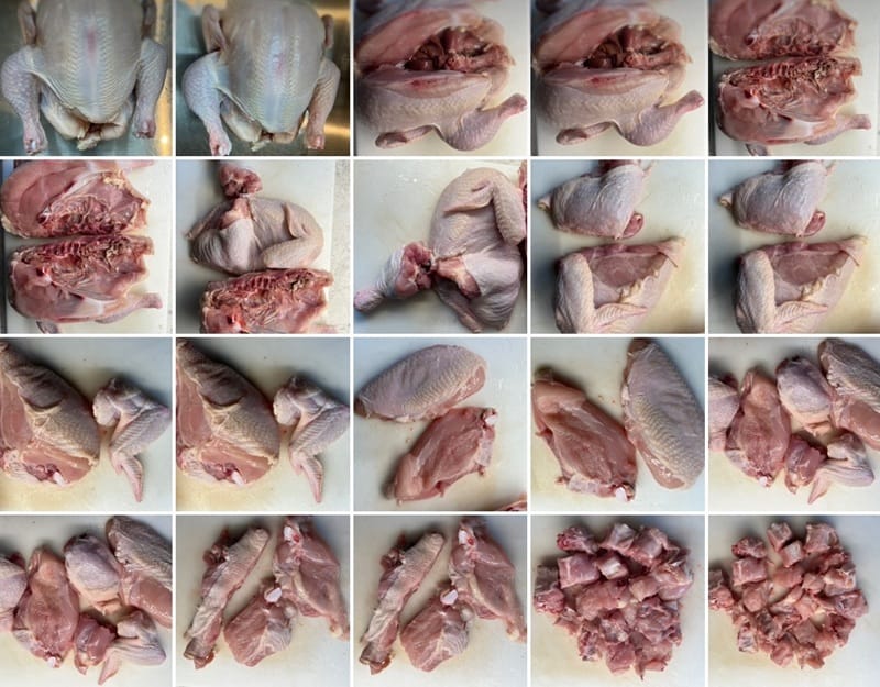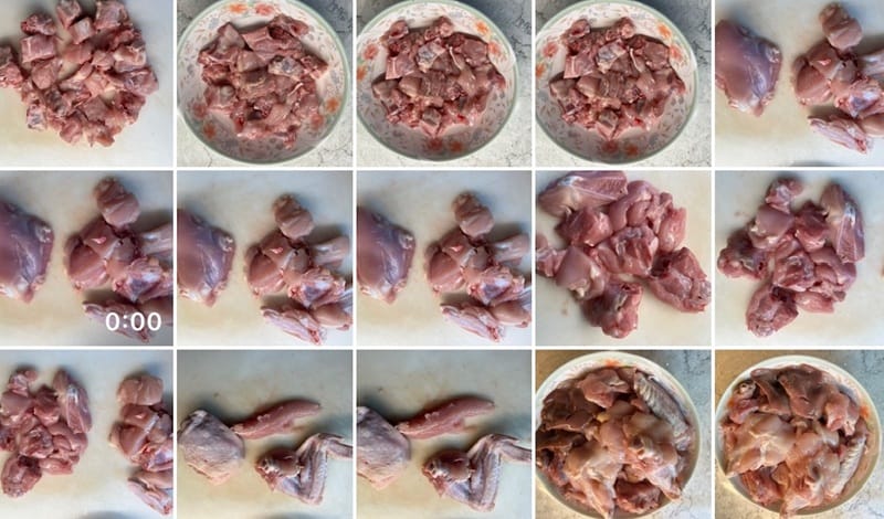- Cut the leg and thigh meat into approximately 2-inch cubes with bone in.